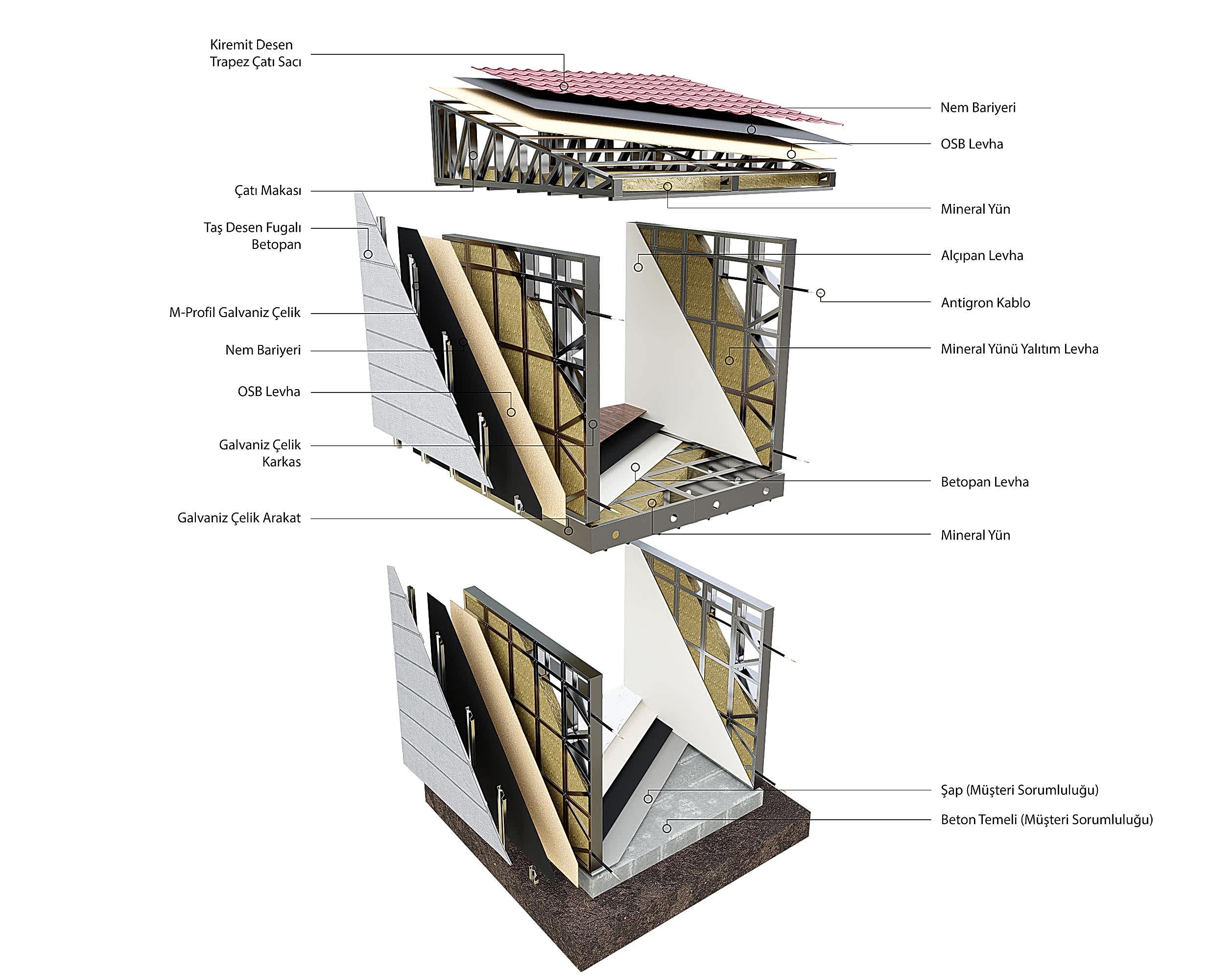| DIŞ YÜZEY KAPLAMASI | 84mm Hafif Çelik karkas üzerine ; 2440x1220x11mm OSB ( (Oriented Strand Board) Nem Bariyeri ( %100 su ve buhar geçirimsiz örtüdür. ) M Profil ( 0,50mm 25x80x25mm ) 8mm Derz Betopanı (Yanmaz, sudan etkilenmez, A1 sınıfı, Presle güçlendirilmiş) 10mm-12mm Taş desenli - Ahşap desenli Betopan (Yanmaz, sudan etkilenmez, A1 sınıfı, Presle güçlendirilmiş) | |