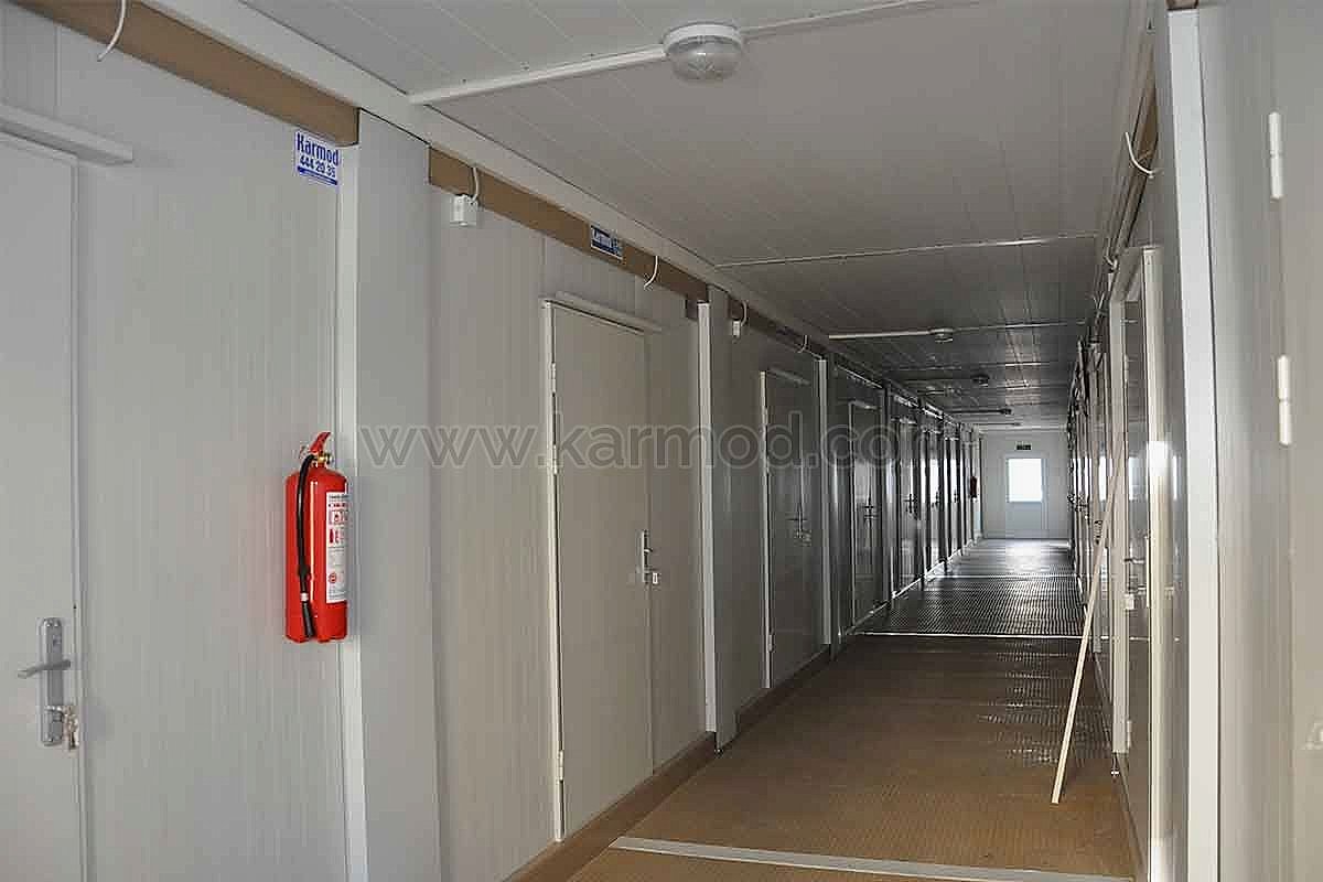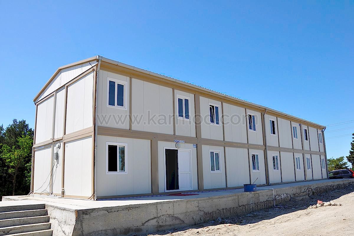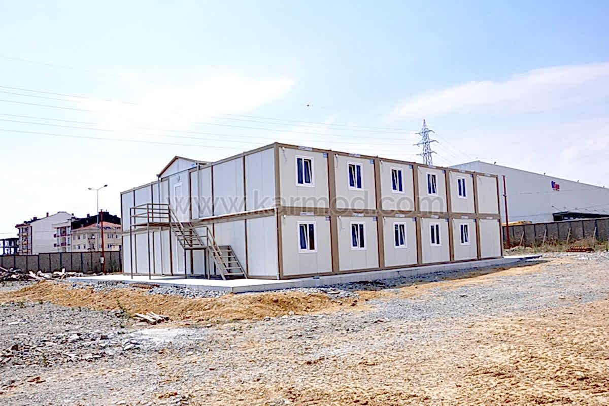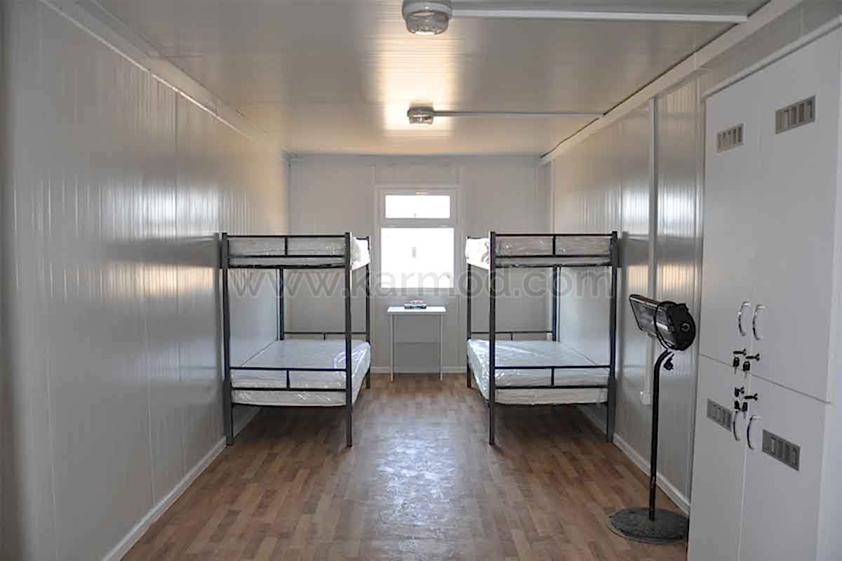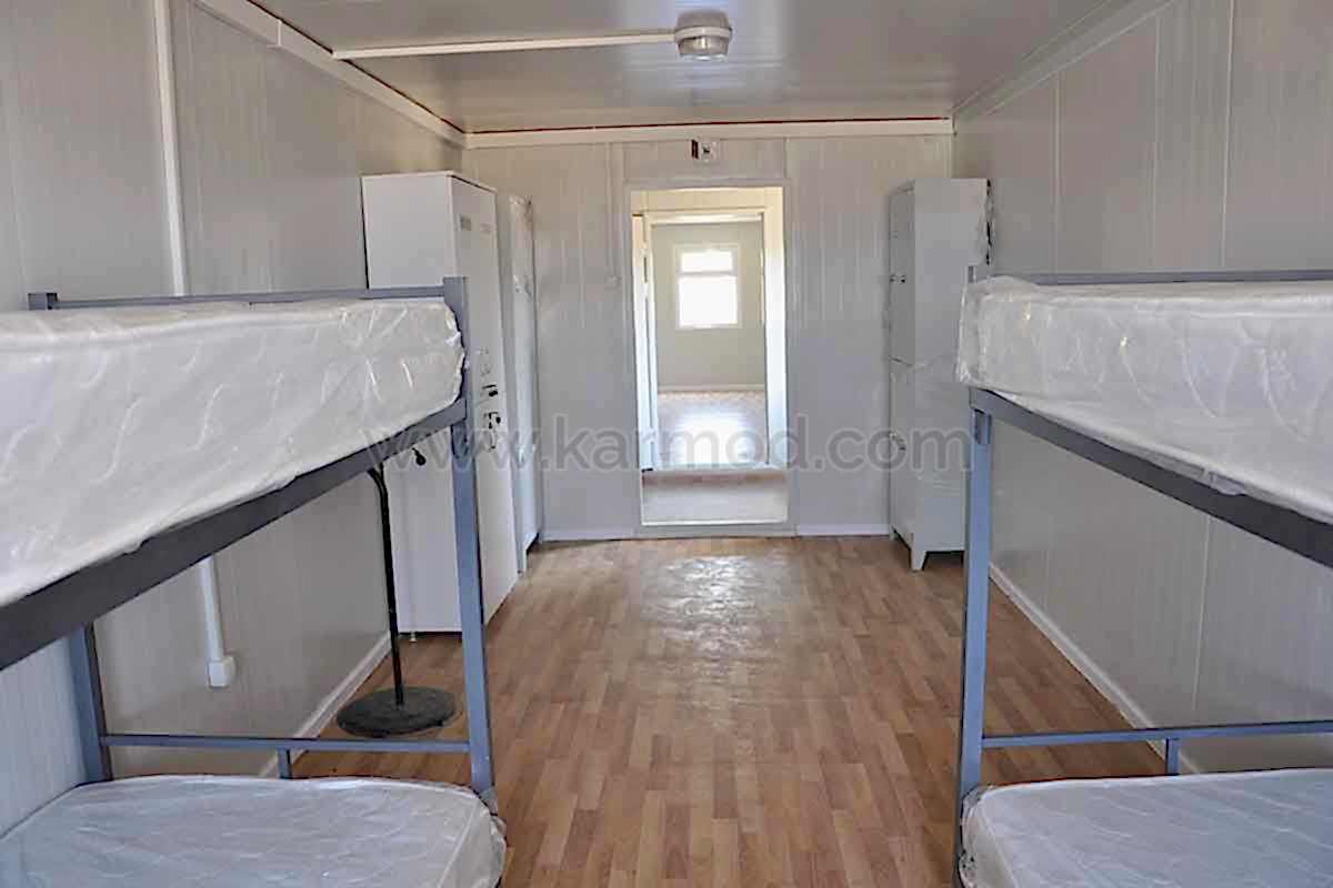 Karmod Prefabrik Yapı Teknolojileri olarak farklı alanlar için 2,4x6 ya da 3x7 ölçülerinde standart üretim sahip yatakhane konteyner ile özel ölçeklendirilebilen birleşimli yatakhane konteyner modeli üretmekteyiz. Kişi güvenliğine öncelik vererek ürünlerimizi kaliteli malzemelerden imal etmekteyiz. Değişen iklim koşullarına, sıcağa ve soğuya dayanıklı ürünler yapmaktayız. Dilerseniz yatakhaneye çatı opsiyonu ekleyebiliriz. Konteyner yatakhane birkaç kez sökülerek tekrar montaj edilebilir. Bu özelliği sayesinde bulunduğu yerden başka yerlere taşımak son derece kolaydır. Estetik görünüme sahip olması için dış ve iç dekorasyonda değişiklikler yapılabilir.