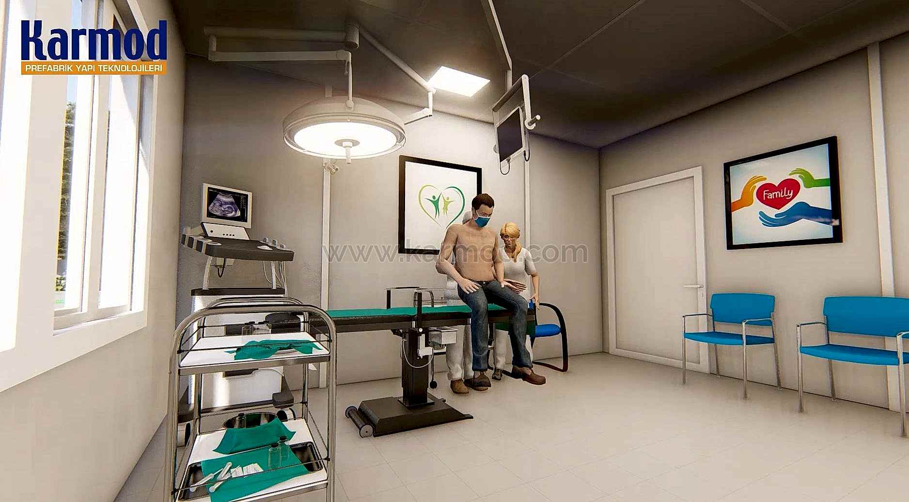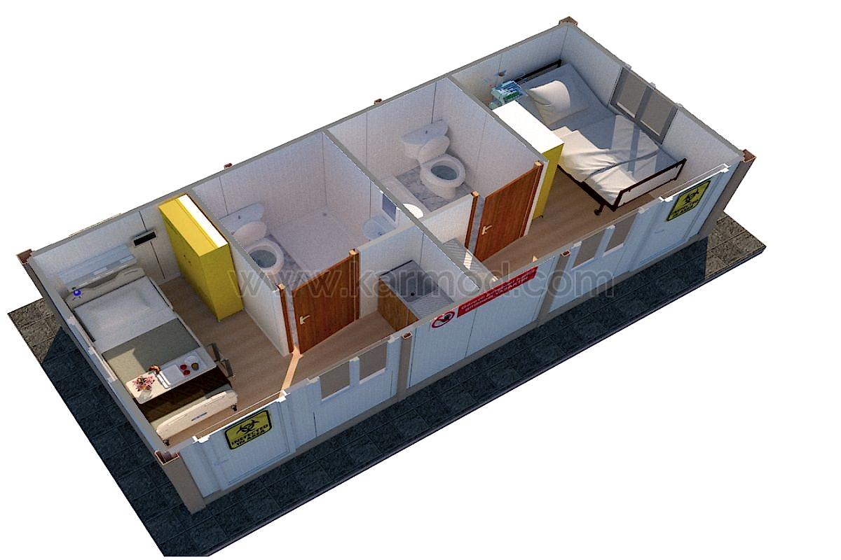 Karmod Mobil Hastane modelimiz kullanıma hazır olarak sevk edilmekte olup büyük metrajlı hastane projelerinde demonte pratik kurulumlu olarak hazırlanmaktadır. Civata – somunlu ve geçmeli sistemin verdiği avantajlar 3 kişilik bir ekiple 100 metrekarelik hastane yapısının 1 günde kurulumu gerçekleştirilerek hizmete alınmaktadır.